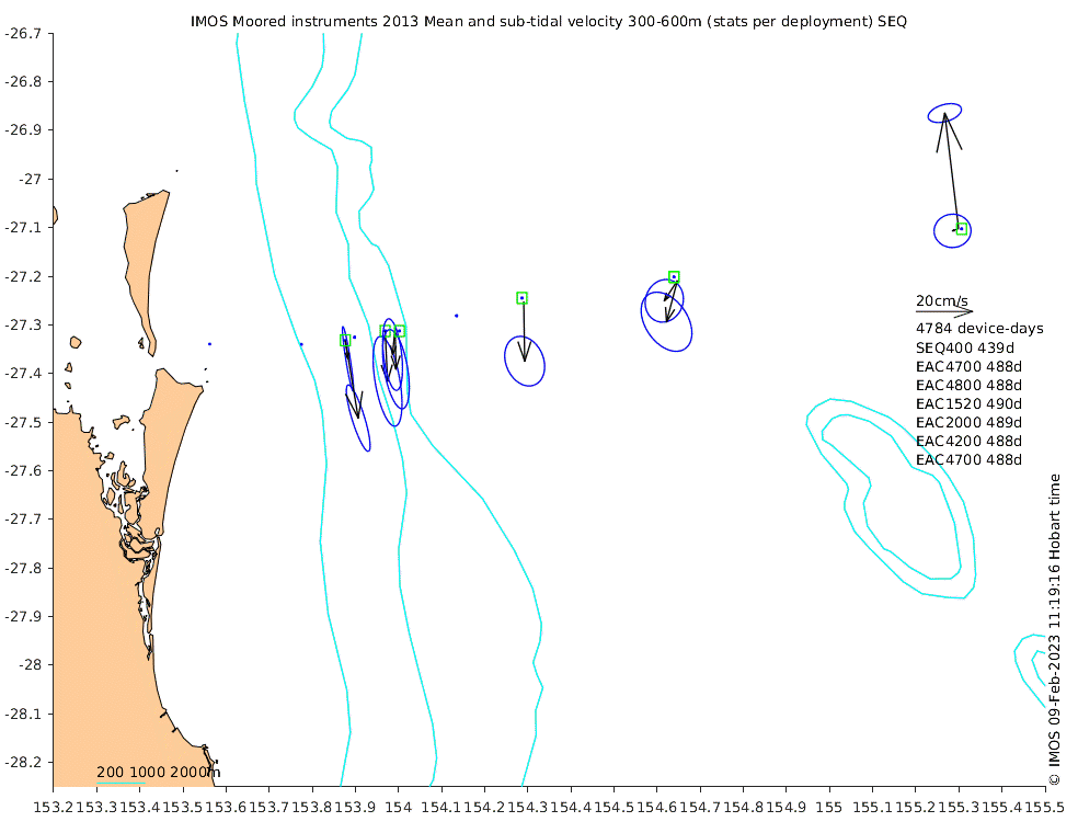 These maps show some basic analyses of the velocity data: mean and sub-tidal variance for several layers and time-windows, and tidal harmonics for the depth-average velocity using the whole record. Click through to see more detailed plots of the selected dataset or to download those data from the AODN thredds server.