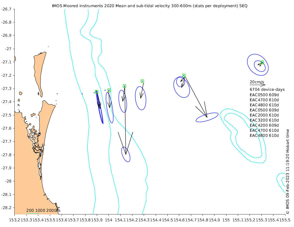 These maps show some basic analyses of the velocity data: mean and sub-tidal variance for several layers and time-windows, and tidal harmonics for the depth-average velocity using the whole record. Click through to see more detailed plots of the selected dataset or to download those data from the AODN thredds server.