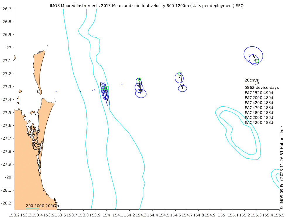 These maps show some basic analyses of the velocity data: mean and sub-tidal variance for several layers and time-windows, and tidal harmonics for the depth-average velocity using the whole record. Click through to see more detailed plots of the selected dataset or to download those data from the AODN thredds server.