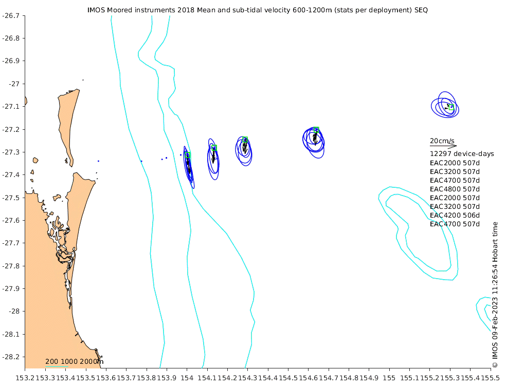 These maps show some basic analyses of the velocity data: mean and sub-tidal variance for several layers and time-windows, and tidal harmonics for the depth-average velocity using the whole record. Click through to see more detailed plots of the selected dataset or to download those data from the AODN thredds server.