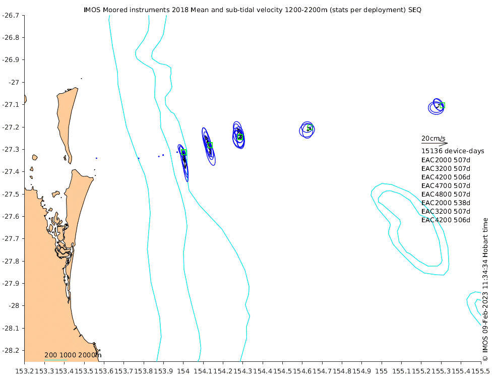 These maps show some basic analyses of the velocity data: mean and sub-tidal variance for several layers and time-windows, and tidal harmonics for the depth-average velocity using the whole record. Click through to see more detailed plots of the selected dataset or to download those data from the AODN thredds server.