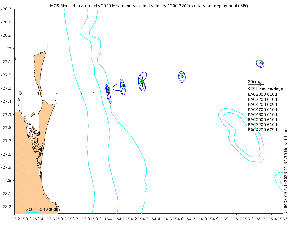 These maps show some basic analyses of the velocity data: mean and sub-tidal variance for several layers and time-windows, and tidal harmonics for the depth-average velocity using the whole record. Click through to see more detailed plots of the selected dataset or to download those data from the AODN thredds server.