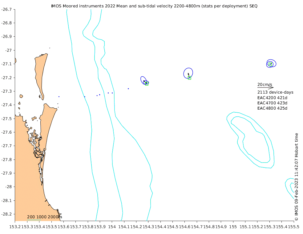 These maps show some basic analyses of the velocity data: mean and sub-tidal variance for several layers and time-windows, and tidal harmonics for the depth-average velocity using the whole record. Click through to see more detailed plots of the selected dataset or to download those data from the AODN thredds server.