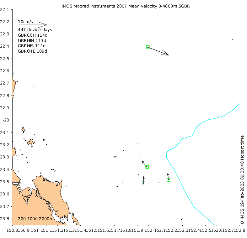 These maps show some basic analyses of the velocity data: mean and sub-tidal variance for several layers and time-windows, and tidal harmonics for the depth-average velocity using the whole record. Click through to see more detailed plots of the selected dataset or to download those data from the AODN thredds server.