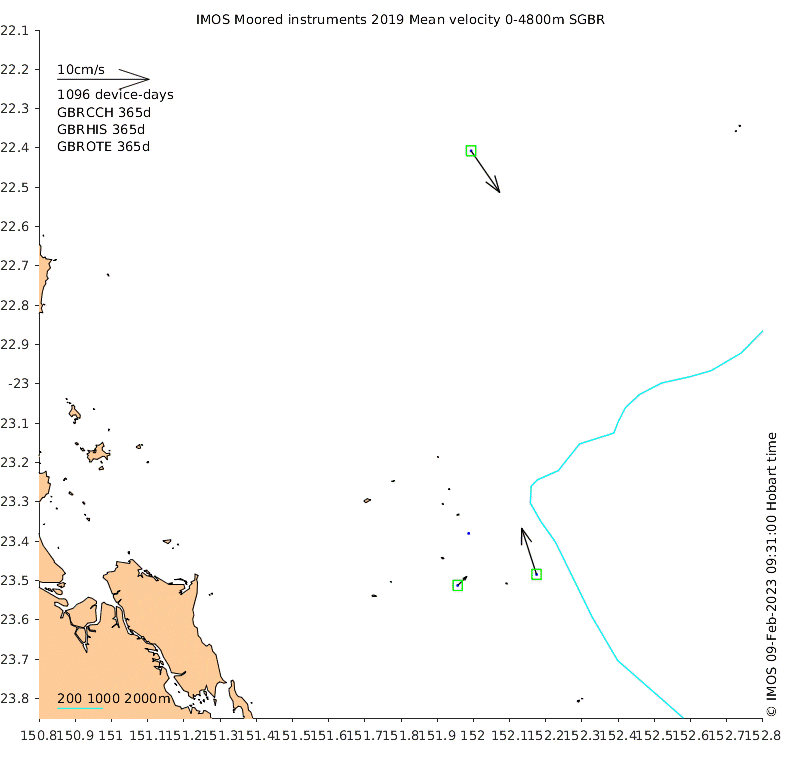 These maps show some basic analyses of the velocity data: mean and sub-tidal variance for several layers and time-windows, and tidal harmonics for the depth-average velocity using the whole record. Click through to see more detailed plots of the selected dataset or to download those data from the AODN thredds server.