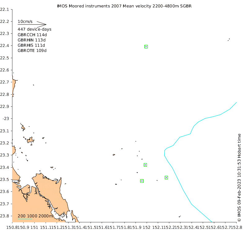 These maps show some basic analyses of the velocity data: mean and sub-tidal variance for several layers and time-windows, and tidal harmonics for the depth-average velocity using the whole record. Click through to see more detailed plots of the selected dataset or to download those data from the AODN thredds server.