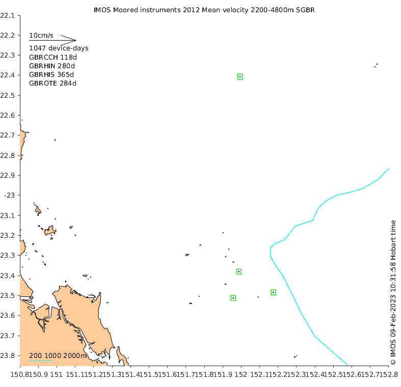 These maps show some basic analyses of the velocity data: mean and sub-tidal variance for several layers and time-windows, and tidal harmonics for the depth-average velocity using the whole record. Click through to see more detailed plots of the selected dataset or to download those data from the AODN thredds server.