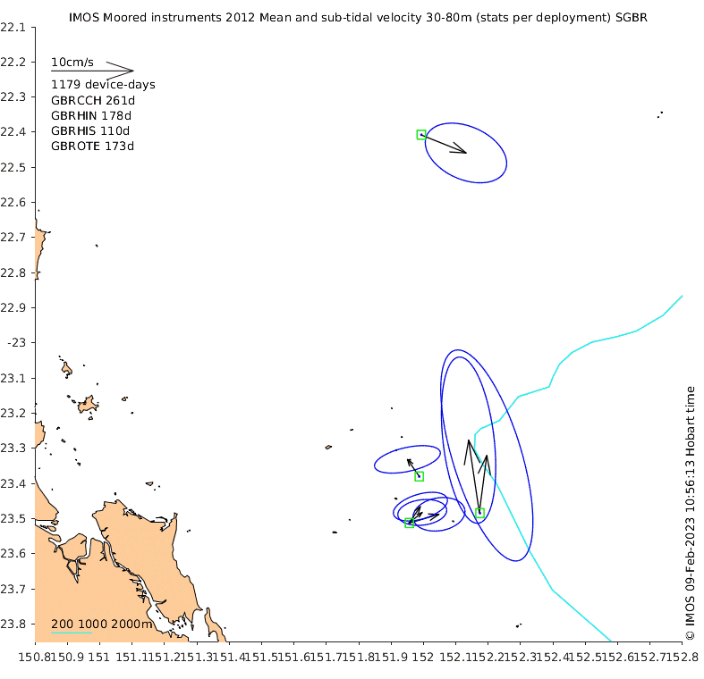 These maps show some basic analyses of the velocity data: mean and sub-tidal variance for several layers and time-windows, and tidal harmonics for the depth-average velocity using the whole record. Click through to see more detailed plots of the selected dataset or to download those data from the AODN thredds server.