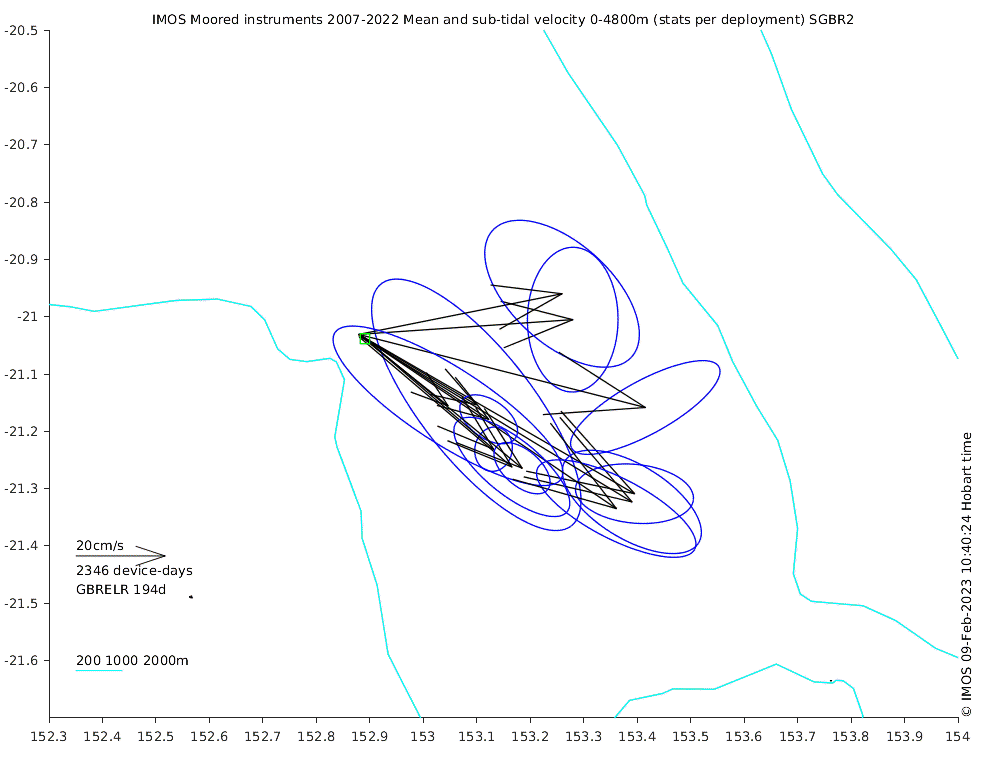 These maps show some basic analyses of the velocity data: mean and sub-tidal variance for several layers and time-windows, and tidal harmonics for the depth-average velocity using the whole record. Click through to see more detailed plots of the selected dataset or to download those data from the AODN thredds server.