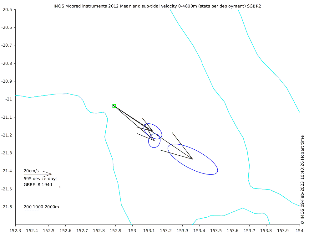 These maps show some basic analyses of the velocity data: mean and sub-tidal variance for several layers and time-windows, and tidal harmonics for the depth-average velocity using the whole record. Click through to see more detailed plots of the selected dataset or to download those data from the AODN thredds server.