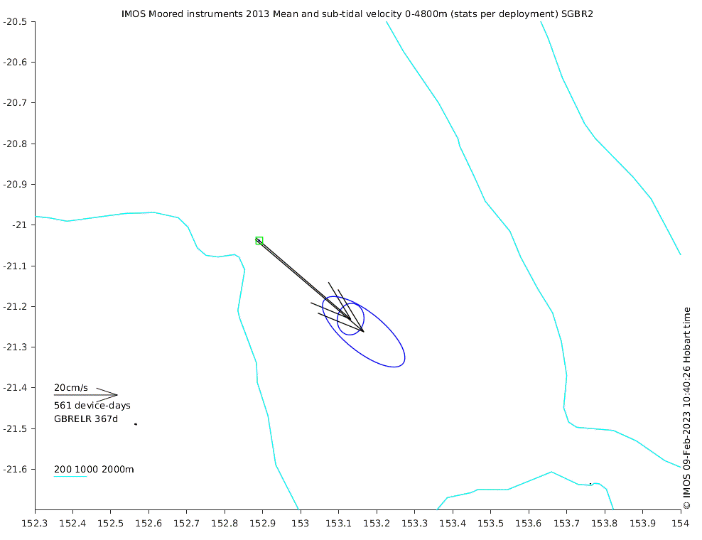 These maps show some basic analyses of the velocity data: mean and sub-tidal variance for several layers and time-windows, and tidal harmonics for the depth-average velocity using the whole record. Click through to see more detailed plots of the selected dataset or to download those data from the AODN thredds server.