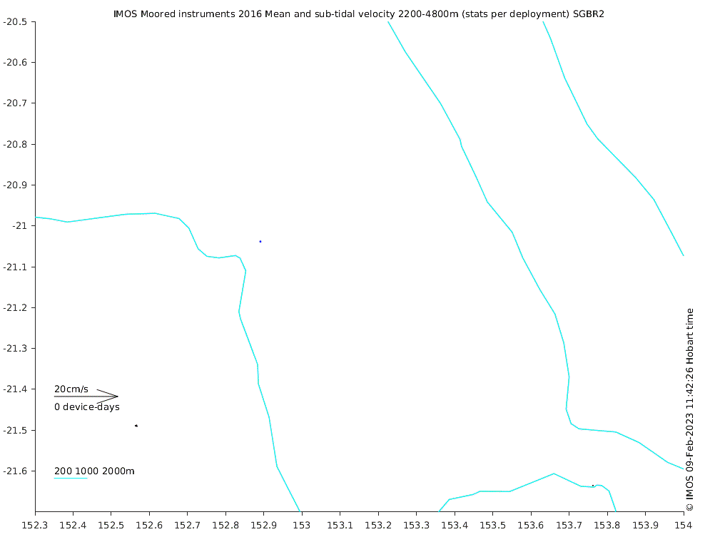 These maps show some basic analyses of the velocity data: mean and sub-tidal variance for several layers and time-windows, and tidal harmonics for the depth-average velocity using the whole record. Click through to see more detailed plots of the selected dataset or to download those data from the AODN thredds server.