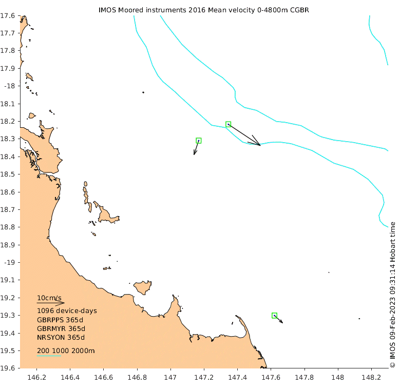 These maps show some basic analyses of the velocity data: mean and sub-tidal variance for several layers and time-windows, and tidal harmonics for the depth-average velocity using the whole record. Click through to see more detailed plots of the selected dataset or to download those data from the AODN thredds server.