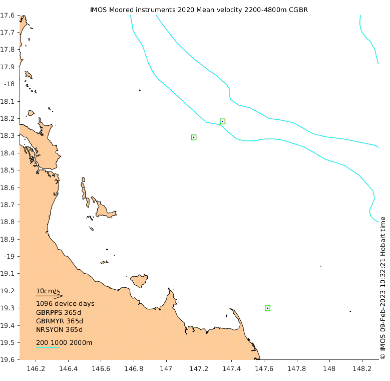 These maps show some basic analyses of the velocity data: mean and sub-tidal variance for several layers and time-windows, and tidal harmonics for the depth-average velocity using the whole record. Click through to see more detailed plots of the selected dataset or to download those data from the AODN thredds server.