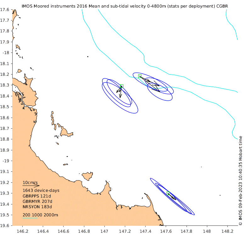 These maps show some basic analyses of the velocity data: mean and sub-tidal variance for several layers and time-windows, and tidal harmonics for the depth-average velocity using the whole record. Click through to see more detailed plots of the selected dataset or to download those data from the AODN thredds server.