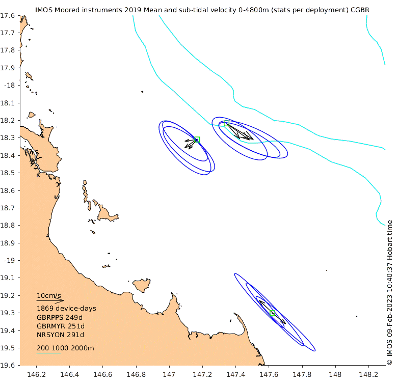 These maps show some basic analyses of the velocity data: mean and sub-tidal variance for several layers and time-windows, and tidal harmonics for the depth-average velocity using the whole record. Click through to see more detailed plots of the selected dataset or to download those data from the AODN thredds server.