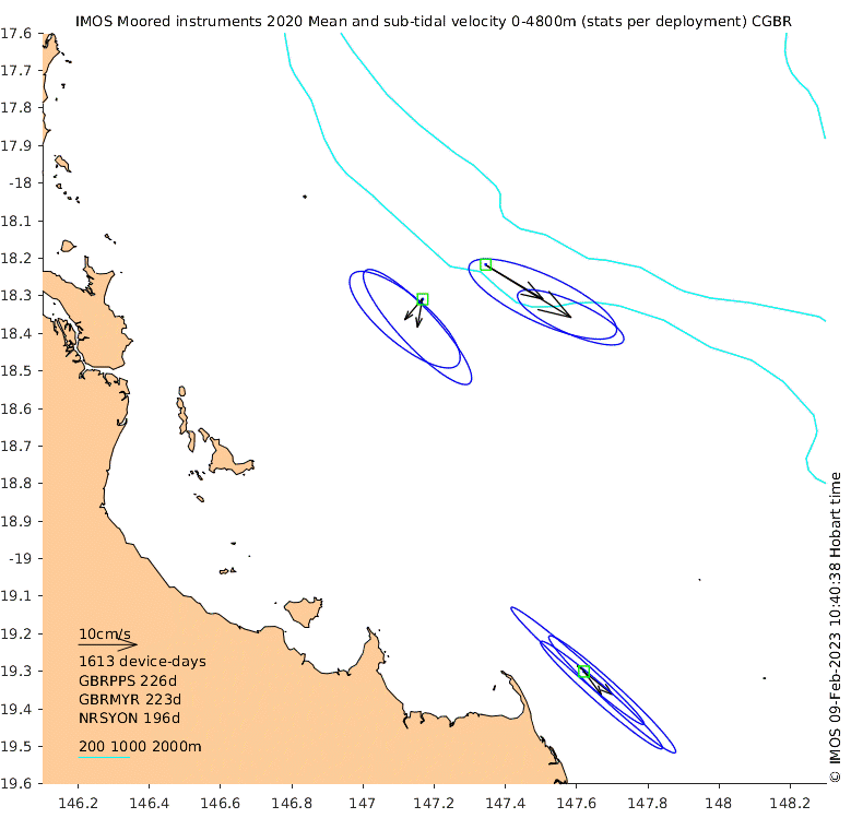 These maps show some basic analyses of the velocity data: mean and sub-tidal variance for several layers and time-windows, and tidal harmonics for the depth-average velocity using the whole record. Click through to see more detailed plots of the selected dataset or to download those data from the AODN thredds server.