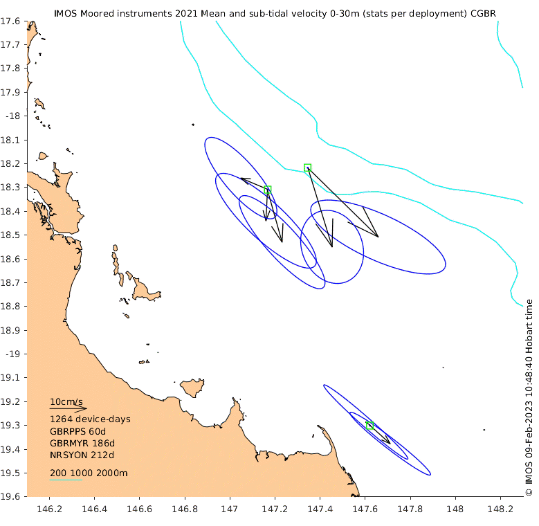 These maps show some basic analyses of the velocity data: mean and sub-tidal variance for several layers and time-windows, and tidal harmonics for the depth-average velocity using the whole record. Click through to see more detailed plots of the selected dataset or to download those data from the AODN thredds server.
