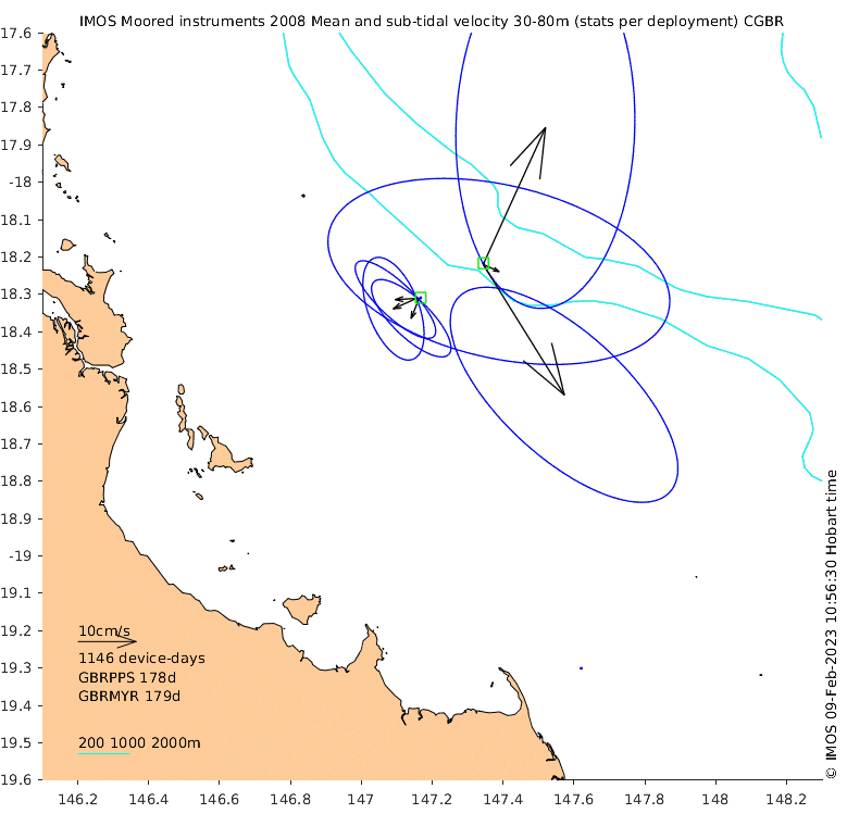 These maps show some basic analyses of the velocity data: mean and sub-tidal variance for several layers and time-windows, and tidal harmonics for the depth-average velocity using the whole record. Click through to see more detailed plots of the selected dataset or to download those data from the AODN thredds server.