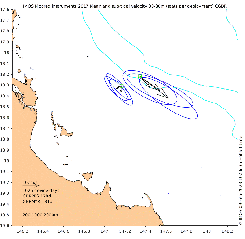 These maps show some basic analyses of the velocity data: mean and sub-tidal variance for several layers and time-windows, and tidal harmonics for the depth-average velocity using the whole record. Click through to see more detailed plots of the selected dataset or to download those data from the AODN thredds server.