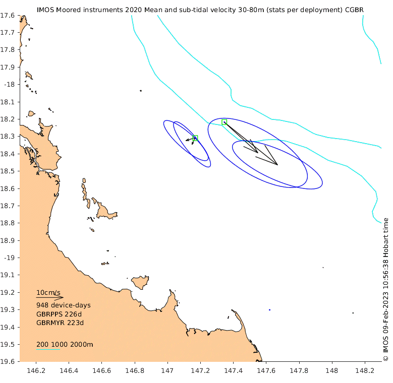 These maps show some basic analyses of the velocity data: mean and sub-tidal variance for several layers and time-windows, and tidal harmonics for the depth-average velocity using the whole record. Click through to see more detailed plots of the selected dataset or to download those data from the AODN thredds server.