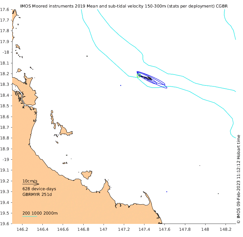 These maps show some basic analyses of the velocity data: mean and sub-tidal variance for several layers and time-windows, and tidal harmonics for the depth-average velocity using the whole record. Click through to see more detailed plots of the selected dataset or to download those data from the AODN thredds server.