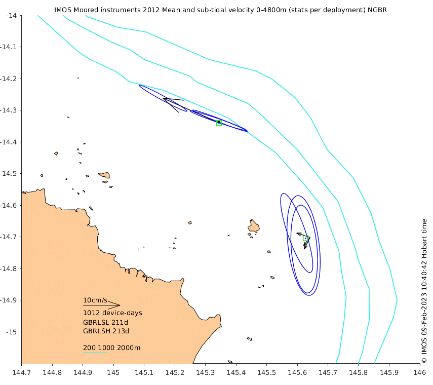 These maps show some basic analyses of the velocity data: mean and sub-tidal variance for several layers and time-windows, and tidal harmonics for the depth-average velocity using the whole record. Click through to see more detailed plots of the selected dataset or to download those data from the AODN thredds server.