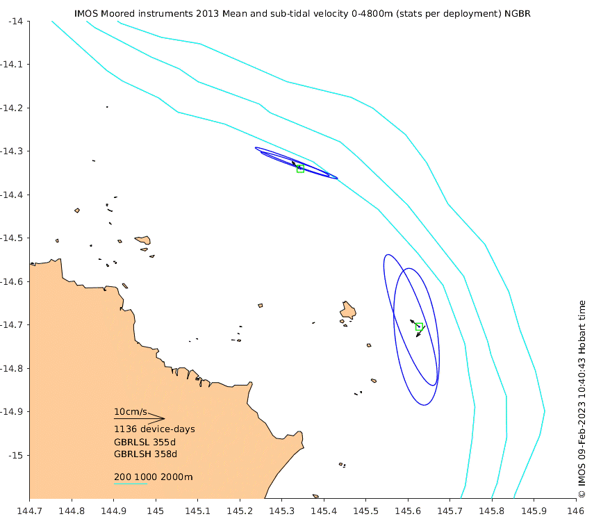 These maps show some basic analyses of the velocity data: mean and sub-tidal variance for several layers and time-windows, and tidal harmonics for the depth-average velocity using the whole record. Click through to see more detailed plots of the selected dataset or to download those data from the AODN thredds server.