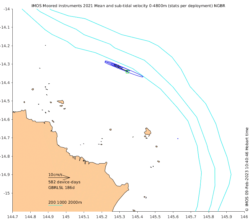 These maps show some basic analyses of the velocity data: mean and sub-tidal variance for several layers and time-windows, and tidal harmonics for the depth-average velocity using the whole record. Click through to see more detailed plots of the selected dataset or to download those data from the AODN thredds server.