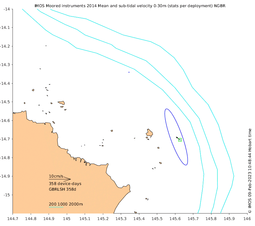 These maps show some basic analyses of the velocity data: mean and sub-tidal variance for several layers and time-windows, and tidal harmonics for the depth-average velocity using the whole record. Click through to see more detailed plots of the selected dataset or to download those data from the AODN thredds server.