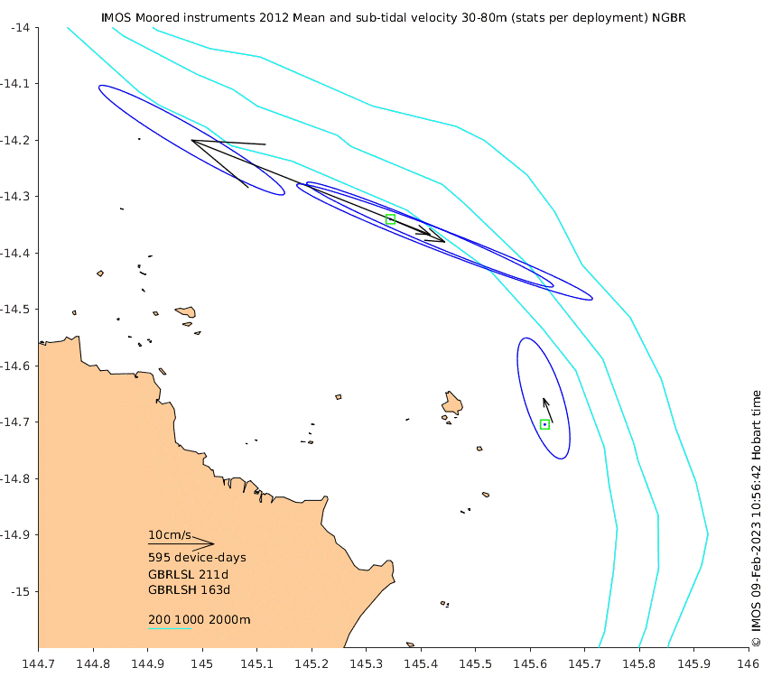 These maps show some basic analyses of the velocity data: mean and sub-tidal variance for several layers and time-windows, and tidal harmonics for the depth-average velocity using the whole record. Click through to see more detailed plots of the selected dataset or to download those data from the AODN thredds server.