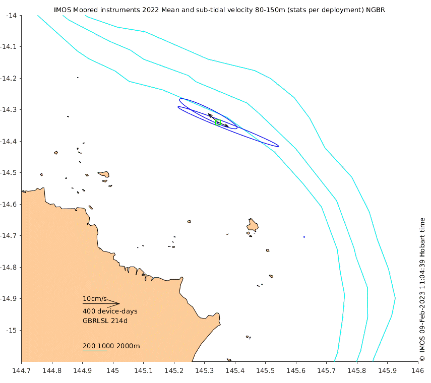 These maps show some basic analyses of the velocity data: mean and sub-tidal variance for several layers and time-windows, and tidal harmonics for the depth-average velocity using the whole record. Click through to see more detailed plots of the selected dataset or to download those data from the AODN thredds server.