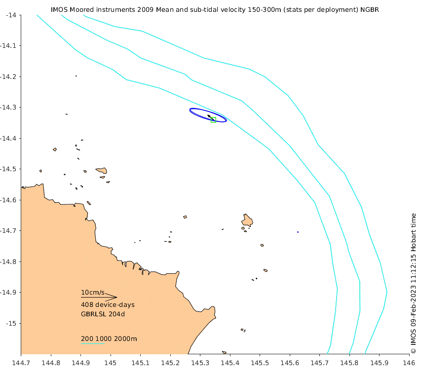 These maps show some basic analyses of the velocity data: mean and sub-tidal variance for several layers and time-windows, and tidal harmonics for the depth-average velocity using the whole record. Click through to see more detailed plots of the selected dataset or to download those data from the AODN thredds server.