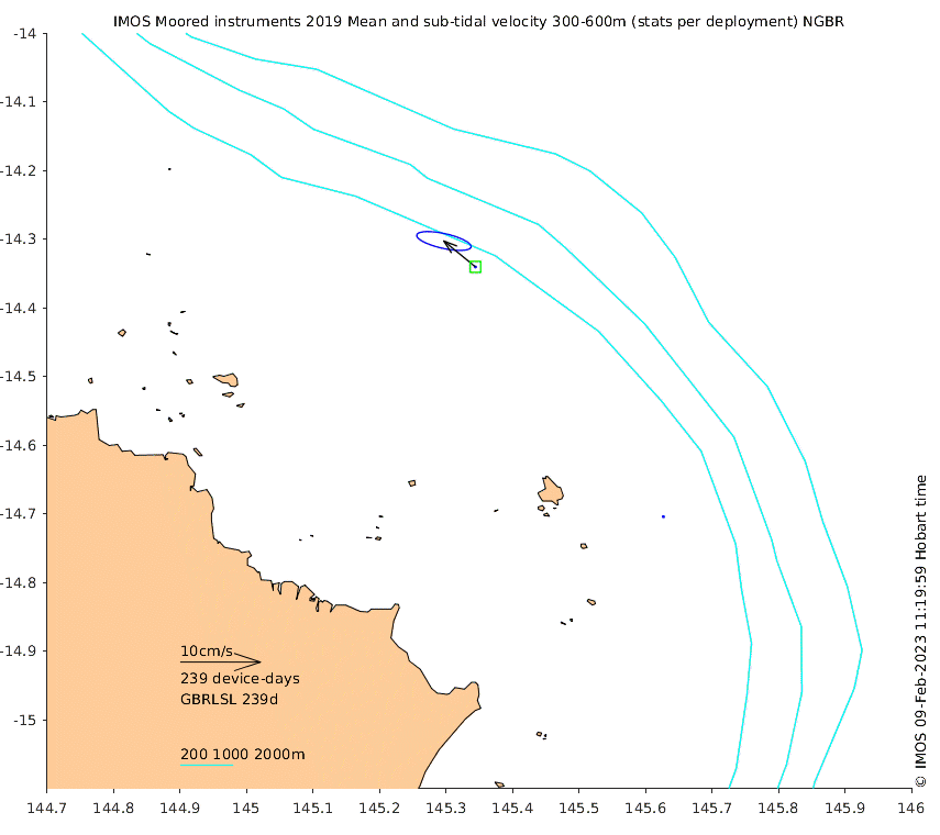 These maps show some basic analyses of the velocity data: mean and sub-tidal variance for several layers and time-windows, and tidal harmonics for the depth-average velocity using the whole record. Click through to see more detailed plots of the selected dataset or to download those data from the AODN thredds server.