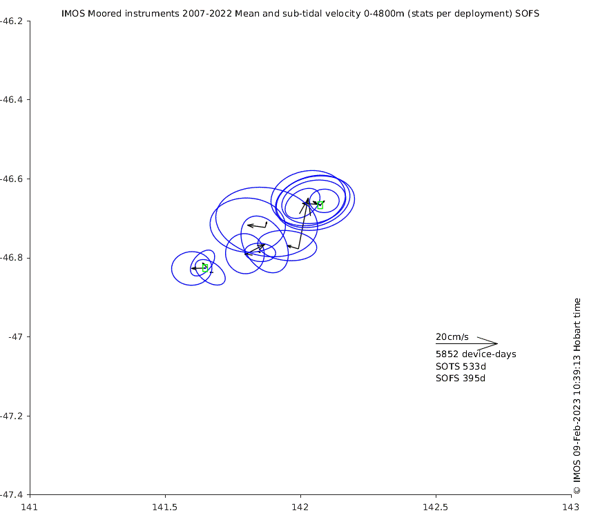 These maps show some basic analyses of the velocity data: mean and sub-tidal variance for several layers and time-windows, and tidal harmonics for the depth-average velocity using the whole record. Click through to see more detailed plots of the selected dataset or to download those data from the AODN thredds server.