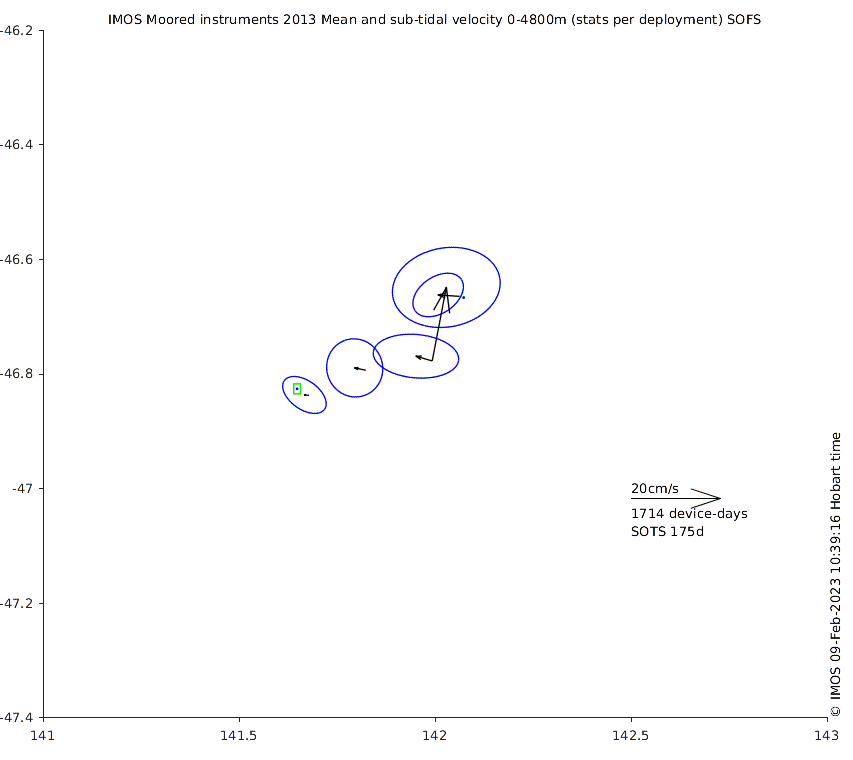 These maps show some basic analyses of the velocity data: mean and sub-tidal variance for several layers and time-windows, and tidal harmonics for the depth-average velocity using the whole record. Click through to see more detailed plots of the selected dataset or to download those data from the AODN thredds server.