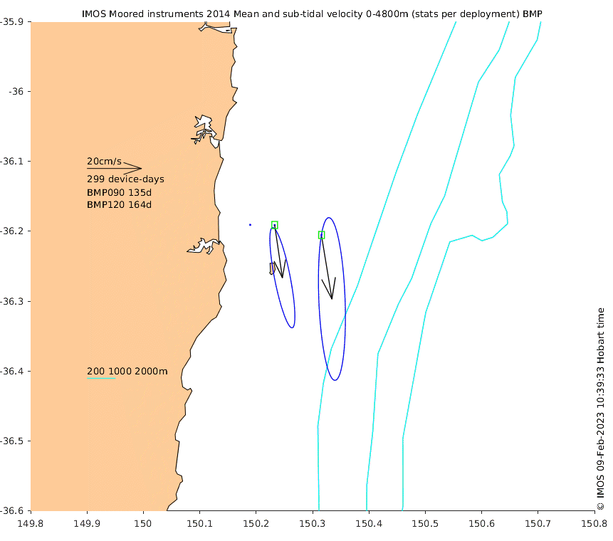 These maps show some basic analyses of the velocity data: mean and sub-tidal variance for several layers and time-windows, and tidal harmonics for the depth-average velocity using the whole record. Click through to see more detailed plots of the selected dataset or to download those data from the AODN thredds server.
