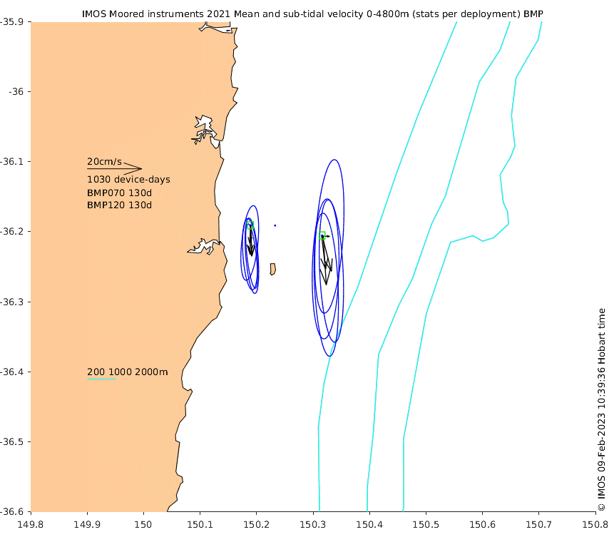 These maps show some basic analyses of the velocity data: mean and sub-tidal variance for several layers and time-windows, and tidal harmonics for the depth-average velocity using the whole record. Click through to see more detailed plots of the selected dataset or to download those data from the AODN thredds server.