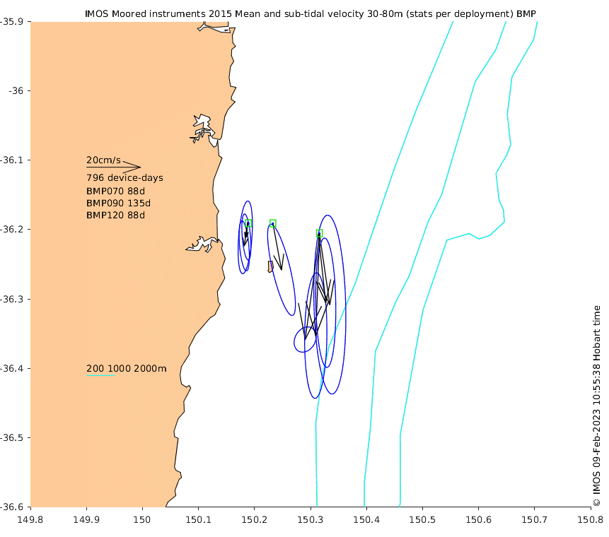 These maps show some basic analyses of the velocity data: mean and sub-tidal variance for several layers and time-windows, and tidal harmonics for the depth-average velocity using the whole record. Click through to see more detailed plots of the selected dataset or to download those data from the AODN thredds server.