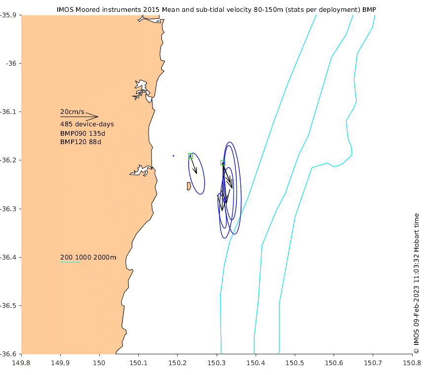 These maps show some basic analyses of the velocity data: mean and sub-tidal variance for several layers and time-windows, and tidal harmonics for the depth-average velocity using the whole record. Click through to see more detailed plots of the selected dataset or to download those data from the AODN thredds server.