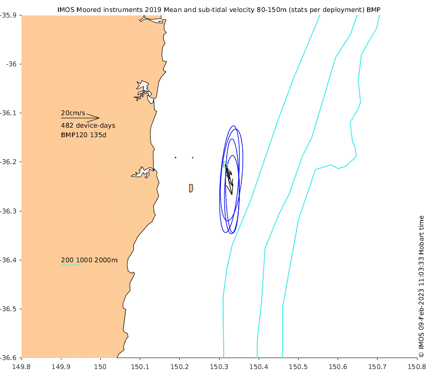 These maps show some basic analyses of the velocity data: mean and sub-tidal variance for several layers and time-windows, and tidal harmonics for the depth-average velocity using the whole record. Click through to see more detailed plots of the selected dataset or to download those data from the AODN thredds server.