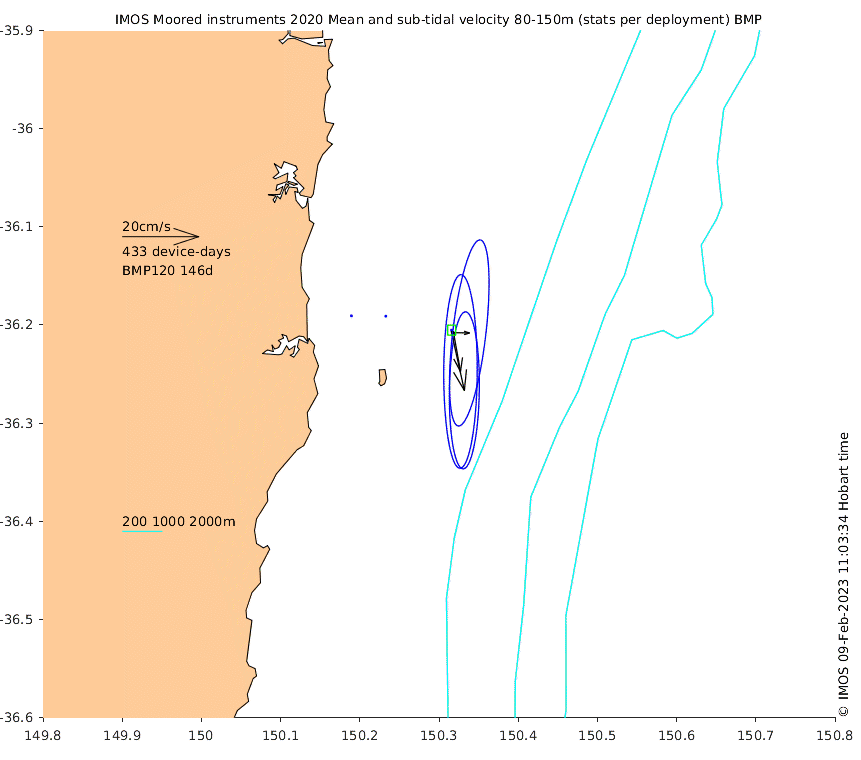 These maps show some basic analyses of the velocity data: mean and sub-tidal variance for several layers and time-windows, and tidal harmonics for the depth-average velocity using the whole record. Click through to see more detailed plots of the selected dataset or to download those data from the AODN thredds server.