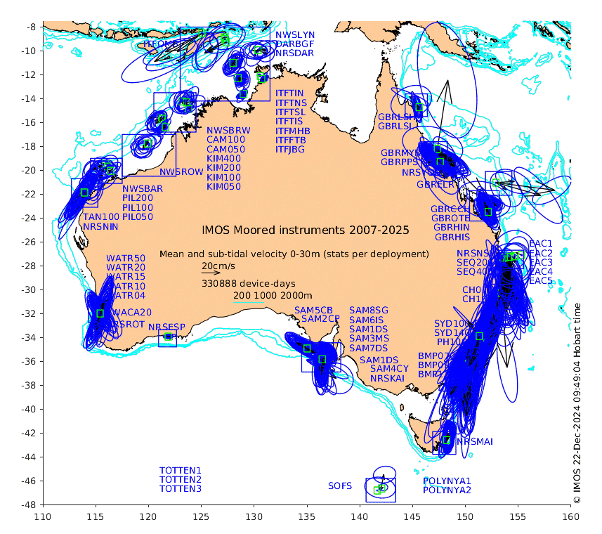 These maps show some basic analyses of the velocity data: mean (all-time in black and seasonal in colour) and sub-tidal variance for several layers and time-windows, and tidal harmonics for the depth-average velocity using the whole record. Click through to see more detailed plots of the selected dataset or to download those data from the AODN thredds server.