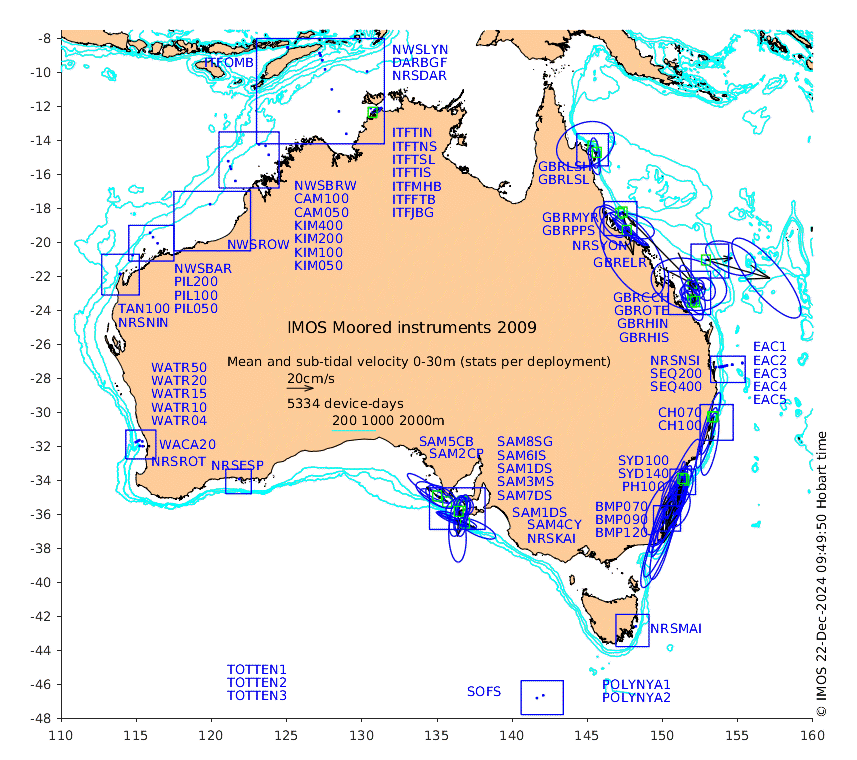 These maps show some basic analyses of the velocity data: mean (all-time in black and seasonal in colour) and sub-tidal variance for several layers and time-windows, and tidal harmonics for the depth-average velocity using the whole record. Click through to see more detailed plots of the selected dataset or to download those data from the AODN thredds server.