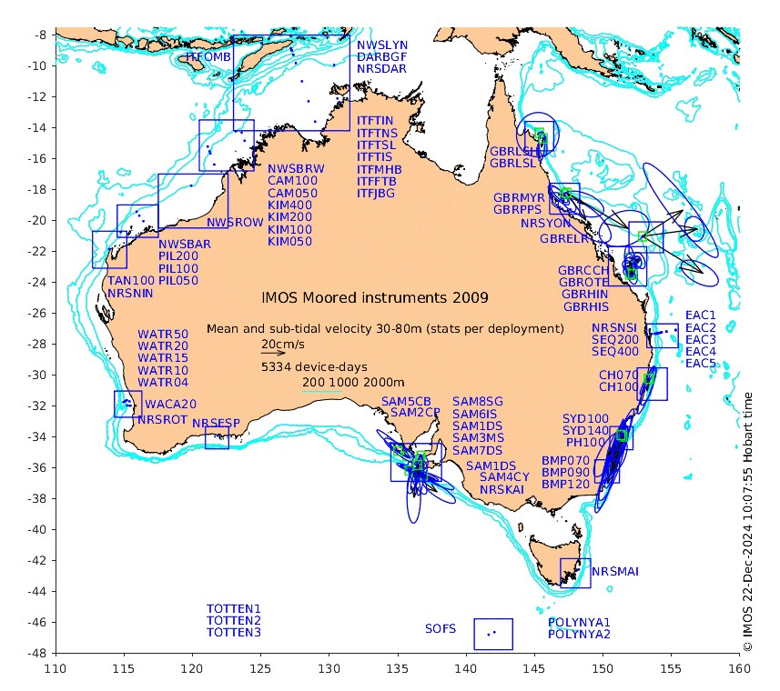 These maps show some basic analyses of the velocity data: mean (all-time in black and seasonal in colour) and sub-tidal variance for several layers and time-windows, and tidal harmonics for the depth-average velocity using the whole record. Click through to see more detailed plots of the selected dataset or to download those data from the AODN thredds server.