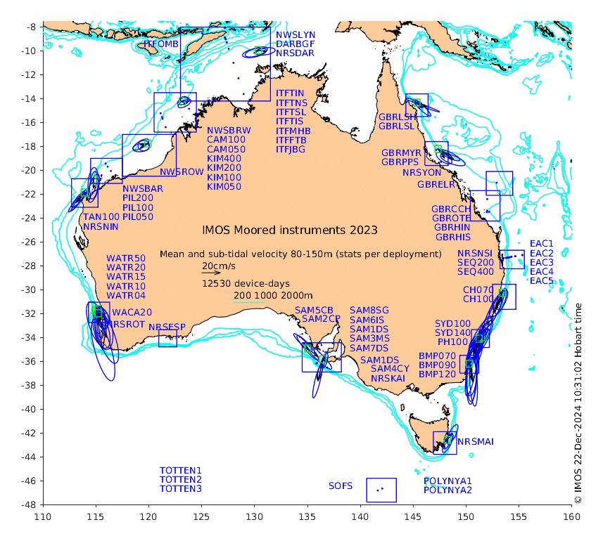 These maps show some basic analyses of the velocity data: mean (all-time in black and seasonal in colour) and sub-tidal variance for several layers and time-windows, and tidal harmonics for the depth-average velocity using the whole record. Click through to see more detailed plots of the selected dataset or to download those data from the AODN thredds server.