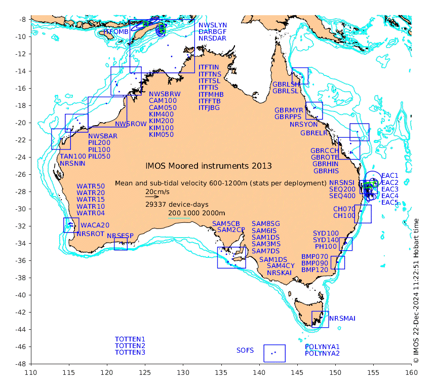 These maps show some basic analyses of the velocity data: mean (all-time in black and seasonal in colour) and sub-tidal variance for several layers and time-windows, and tidal harmonics for the depth-average velocity using the whole record. Click through to see more detailed plots of the selected dataset or to download those data from the AODN thredds server.