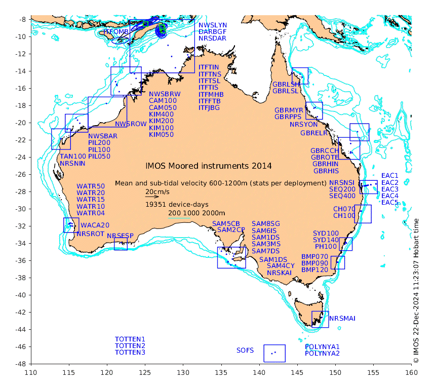 These maps show some basic analyses of the velocity data: mean (all-time in black and seasonal in colour) and sub-tidal variance for several layers and time-windows, and tidal harmonics for the depth-average velocity using the whole record. Click through to see more detailed plots of the selected dataset or to download those data from the AODN thredds server.