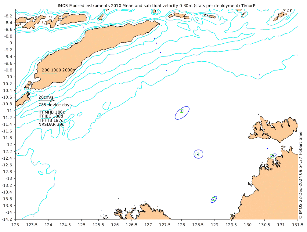These maps show some basic analyses of the velocity data: mean (all-time in black and seasonal in colour) and sub-tidal variance for several layers and time-windows, and tidal harmonics for the depth-average velocity using the whole record. Click through to see more detailed plots of the selected dataset or to download those data from the AODN thredds server.