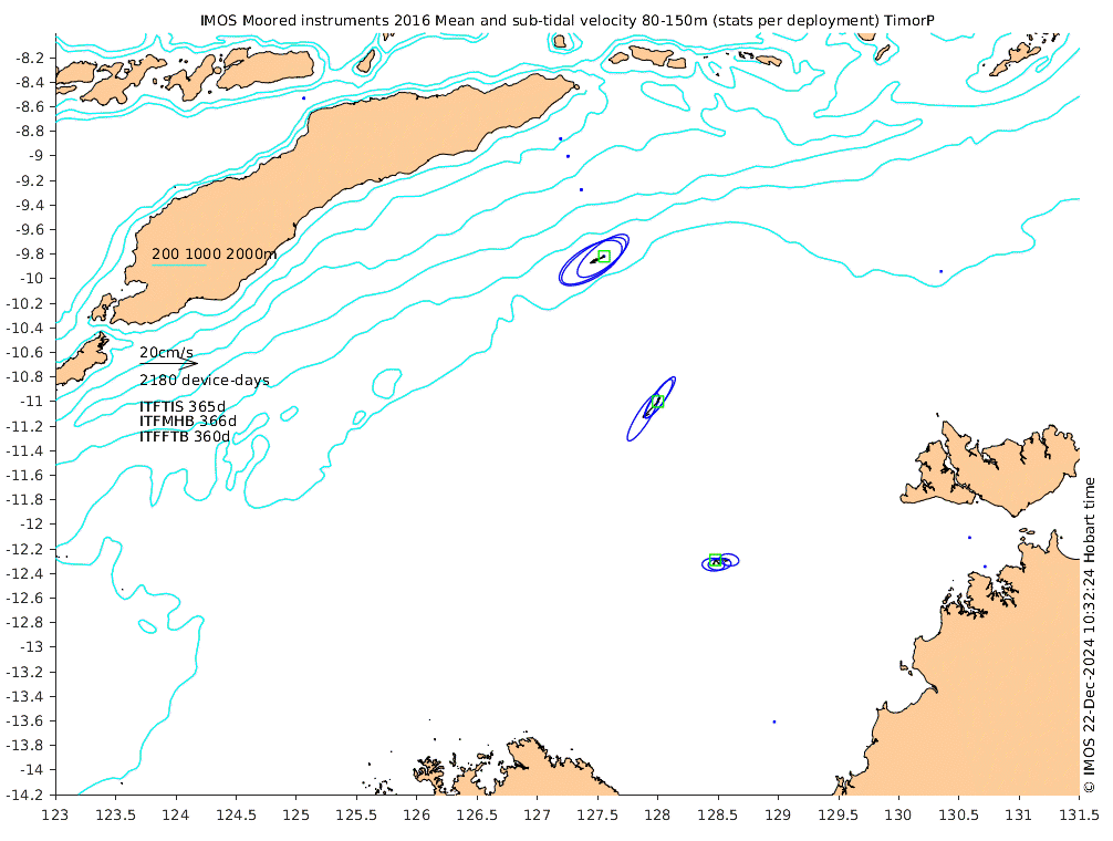 These maps show some basic analyses of the velocity data: mean (all-time in black and seasonal in colour) and sub-tidal variance for several layers and time-windows, and tidal harmonics for the depth-average velocity using the whole record. Click through to see more detailed plots of the selected dataset or to download those data from the AODN thredds server.
